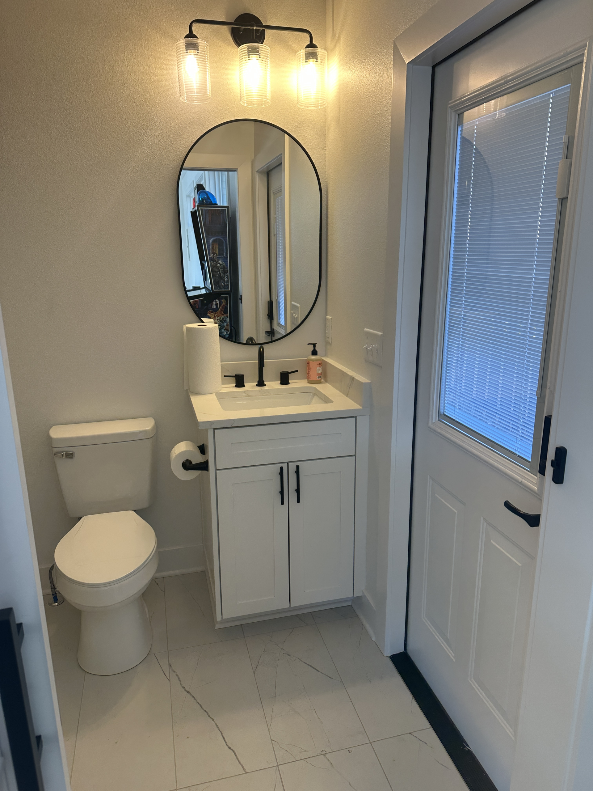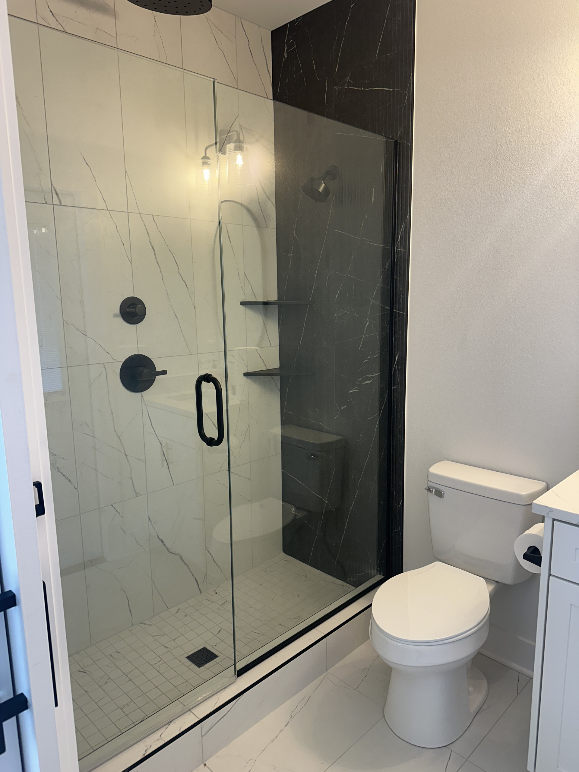The bathroom itself is a standout, featuring floor-to-ceiling marble tile in a sophisticated two-tone palette, a rimless glass shower enclosure, rain-style overhead shower, and coordinated black fixtures throughout. Every element—from material selection to layout and finishes—reflects Alpha Echo’s dedication to precision, durability, and delivering spaces that elevate how homeowners live and entertain.